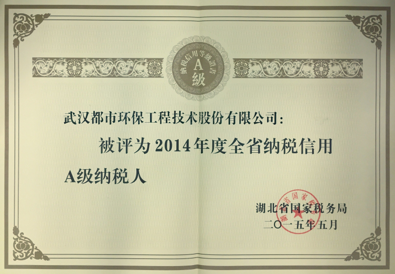 2015年5月,經嚴格評審,武漢都市環保工程技術股份有限公司被湖北省國家稅務局評為“2014年度全省納稅信用A級納稅人”。至此,公司已連續三年獲得省市“A級納稅人”榮譽稱號,得到了稅務機關的充分肯定。