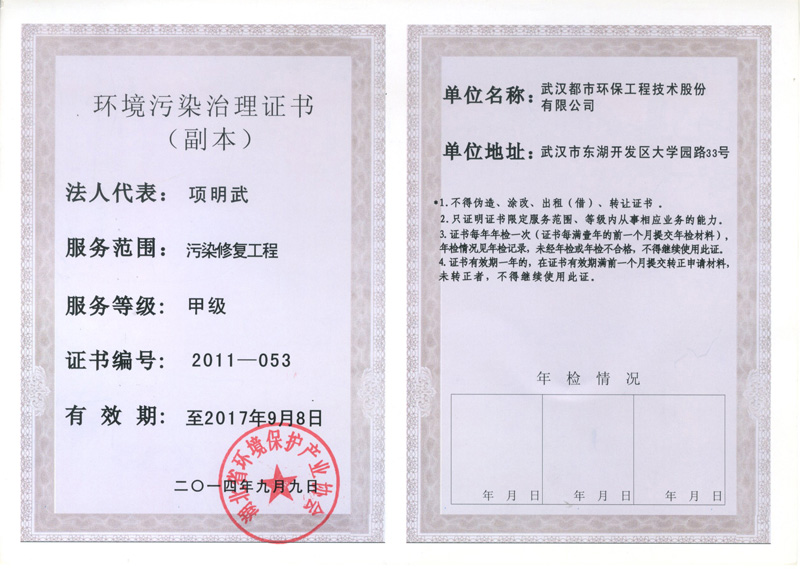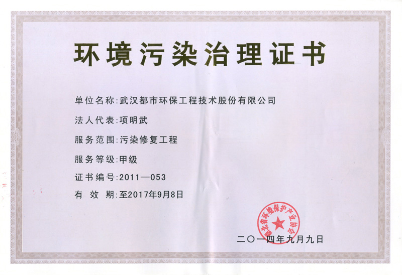 ??? 省環保產業協會領導、專家一致同意都市環保湖北省環境污染治理(污染修復工程)甲級資質的換證,有效期至2017年9月8日。