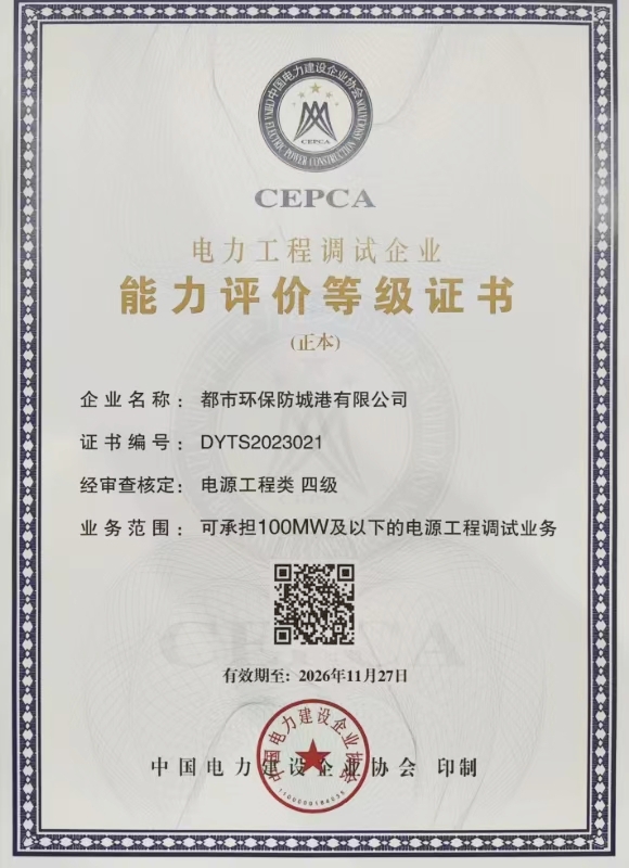 都市環(huán)保防城港有限公司順利獲批企業(yè)電源工程類四級(jí)調(diào)試資質(zhì)證書