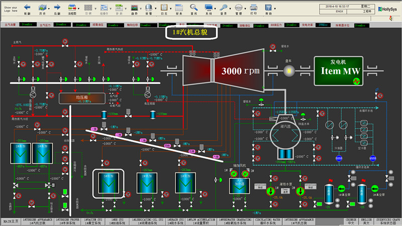 在整體的布局中,背景色經多種顏色反復試用后,最后選定柔和的深灰色。設備控制圖標大都遵循橫平豎直斜對齊(如圖中白線所示)。液位柱狀圖與罐狀設備示意圖整體重合,選用漸變色顯得設備更有真實感。每張界面的標題中心(如圖中“1#汽機總貌”)嚴格規劃在同一坐標位置,字體大小一致,切換畫面時無漂移感。根據汽、水等不同的功能、特性,用不同的線徑、線型和顏色來區分不同的線路。針對運營人員提出的視覺疲勞問題,在顏色的亮暗選擇上也做了一定的考究。